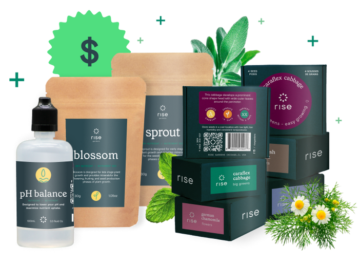 Rise Reward members earn 1 point for every $1 spent on seed, nutrient, and accessory purchases with Rise Gardens. If you subscribe to a Rise Gardens Membership, points are automatically multiplied on purchases you make. Seasonal members earn double points and annual members earn triple points.